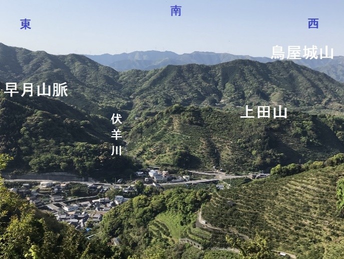 この言葉は石川五右衛門が京都・南禅寺の山門の屋上から満開の桜を愛でた歌舞伎の口上ですが、これから紹介する場所からの眺めはまさに絶景、圧巻です。その場所とは、来見屋城(くるみやじょう:通称「城の天」:標高385m)跡から少し下った大岩です。眼下には吉田の地域が一望でき、東には、早月に向かう山並み、西には金屋、吉備そして湯浅の海や島々まで、南には上田山、鳥屋城山(標高305m)、さらに南の山々も見ることができます。ここからなら、兵士がどういう動きをしているかが分かるという絶好の場所でもあります。